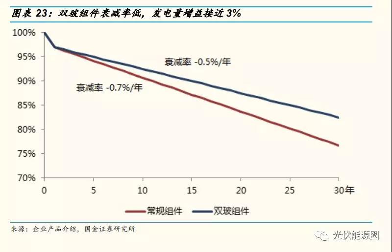 雙玻組件憑借更低衰減率可使發(fā)電量增長 3%左右,但玻璃替代背板后透
