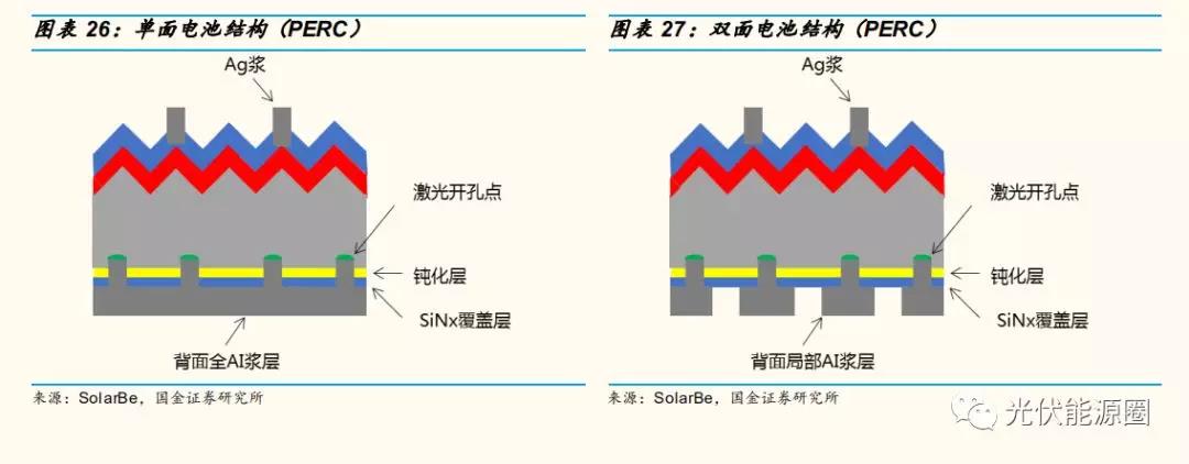電池背面效率略低于正面,背面透光導(dǎo)致正面效率略降:由于激光開孔點(diǎn)仍然需要柵格來疏導(dǎo)光生電流,故電池背面大部分區(qū)域仍覆蓋了Al/Ag 漿,且鋁柵格導(dǎo)電性不如銀柵格,故鋁柵線較寬,背面覆蓋率高達(dá) 30%~40% , 因 此 背 面 可 吸 收 光 線 的 區(qū) 域 有 限 , 轉(zhuǎn) 化 效 率