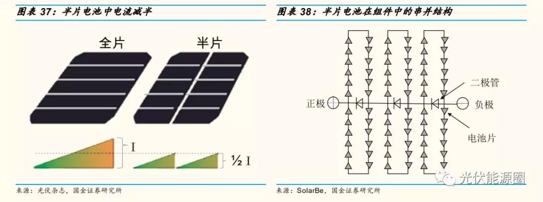 電流減半,電阻損耗降低,功率提升 5~10W。將電池片切半進(jìn)行焊接串聯(lián),使得其電流降為原來的 1/2,因此其電阻損耗就下降到原來的 25%