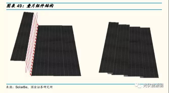 疊片技術(shù)通過交疊電池小片,實(shí)現(xiàn)無電池片間距,在同樣面積下可以放置更多的電池片,從而有效擴(kuò)大了電池片受光面積,發(fā)電增益可達(dá) 18.5%,組件效率可提升到 18.81%,遠(yuǎn)高于半片、多主柵等組件技術(shù):